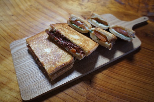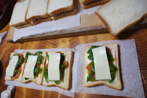 パンの外側にバターをぬってチーズ、トマト、バジルをのせて